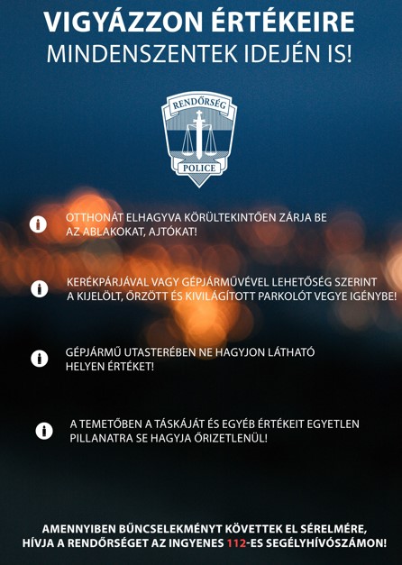 Fontos, hogy a közelgő ünnepek alatt kiemelten figyeljen értékei védelmére, hiszen az emlékezés perceiben a bűnelkövetők ellophatják a síroknál felügyelet nélkül hagyott táskákat, a lezáratlan kerékpárokat, a temető előtt parkoló autókban látható helyen hagyott tárgyakat. A zsúfolt tömegközlekedési eszközökön értékeit tartsa testközelben, feltűnő ékszereit hagyja otthon! Otthonát elhagyva zárja be az ablakokat, ajtókat még akkor is, ha rövid időre megy el!