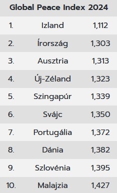 A nemrég nyilvánosságra hozott 2024-es index alapján az első helyen Izland szerepel 1,112-es pontszámmal, őket Írország (1,303) és Ausztria (1,313) követi. Sűrű a mezőny az élen, kicsik a különbségek, ahogy az az alábbi táblázatban is látható.