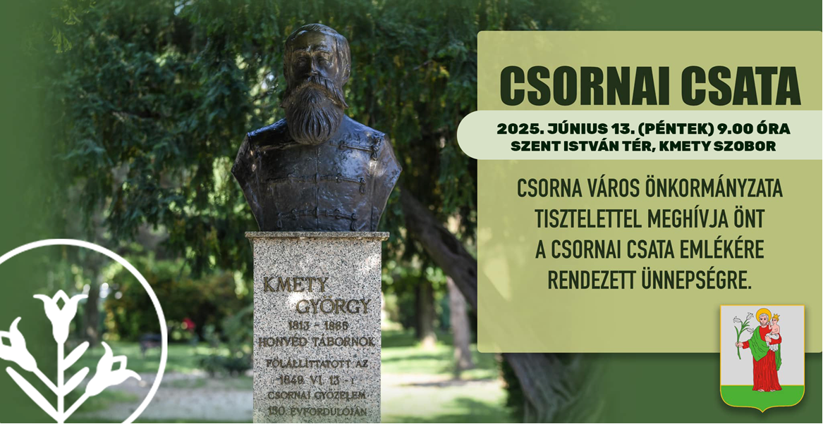 Június 13-án pénteken, reggel 9 órától Csorna városa méltó ünnepség keretében tiszteleg a Csornai Csata hősei előtt a Szent István téren, a Kmety-szobornál.