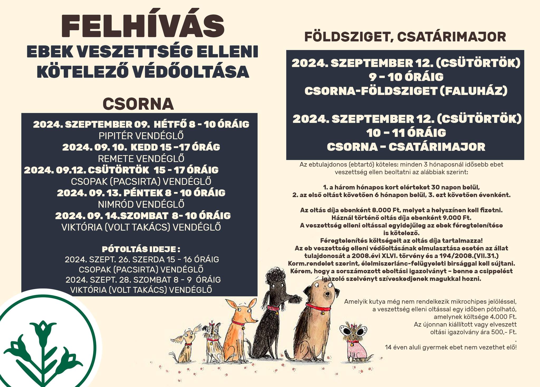 A Csorna Város Önkormányzatának Jegyzője értesíti a lakosságot, hogy 2024 szeptemberében a településen ismét megrendezésre kerül az ebek veszettség elleni kötelező védőoltása. Az oltások több helyszínen, különböző időpontokban lesznek elérhetőek, hogy a kutyatulajdonosoknak lehetőségük legyen időben beoltatni kedvenceiket.