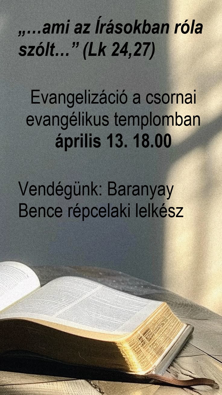 A csornai evangélikus gyülekezet szeretettel hív és vár minden érdeklődőt április 13-án, szombaton 18:00 órától evangelizációt tartunk a templomunkban.
