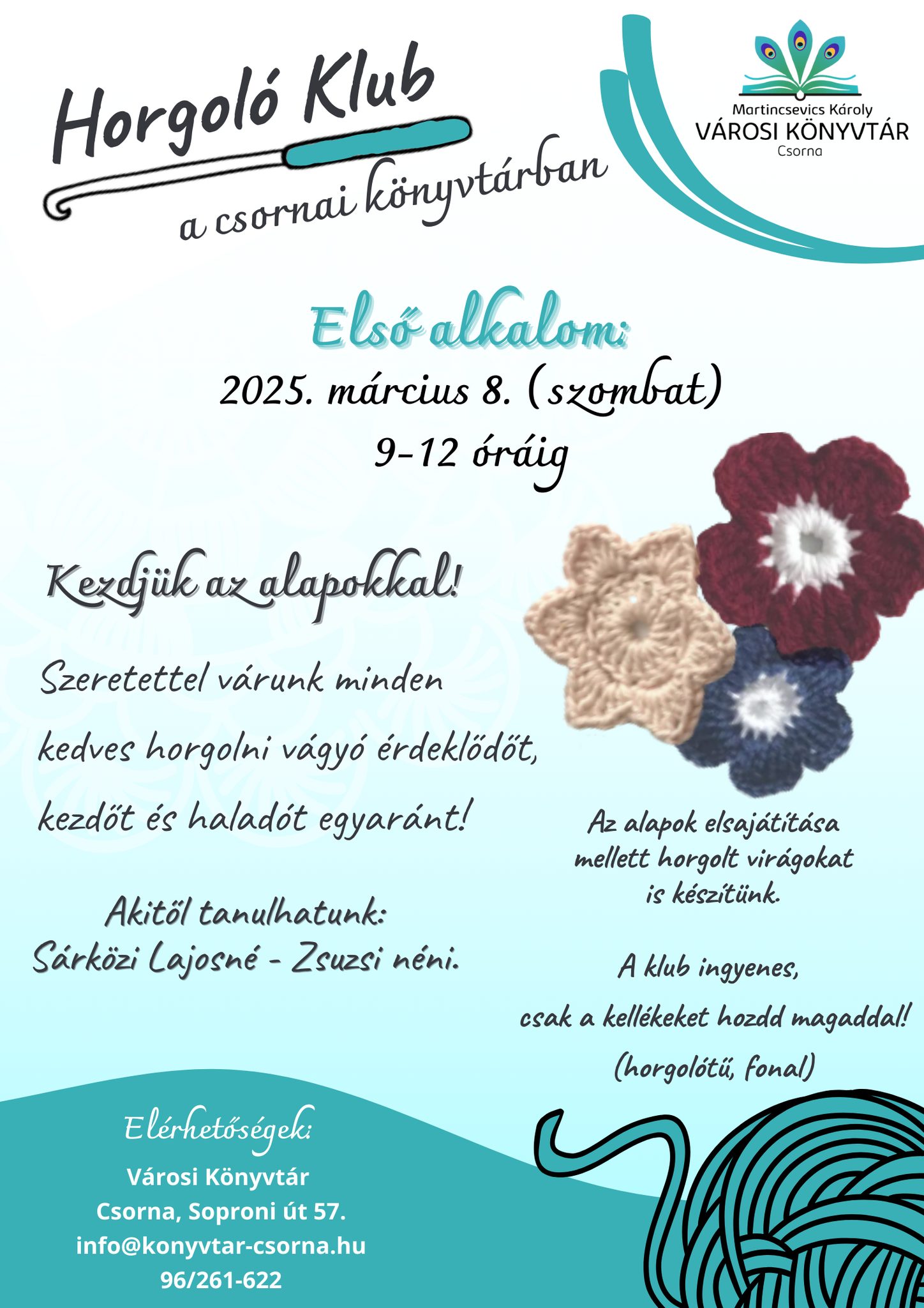 A csornai Martincsevics Károly Városi Könyvtár egy izgalmas új kezdeményezést indít el: Horgoló Klubot szervez mindazok számára, akik szeretnének megismerkedni ezzel a kreatív kézműves tevékenységgel vagy tovább fejlesztenék tudásukat.
