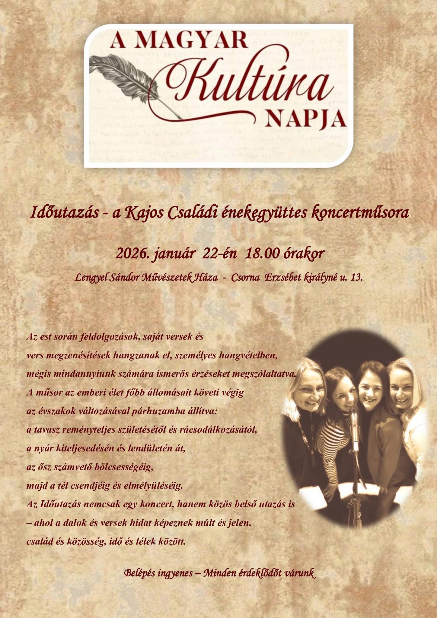 Az Időutazás című esten a Kajos Családi énekegyüttes várja az érdeklődőket 2026. január 22-én 18 órától a Lengyel Sándor Művészetek Házában.