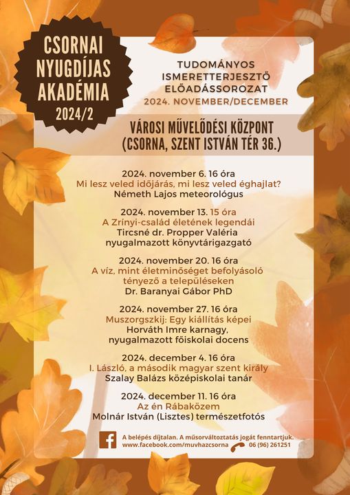 A Csornai Nyugdíjas Akadémia november-decemberi ismeretterjesztő előadás-sorozatot szervez a Városi Művelődési Központban.