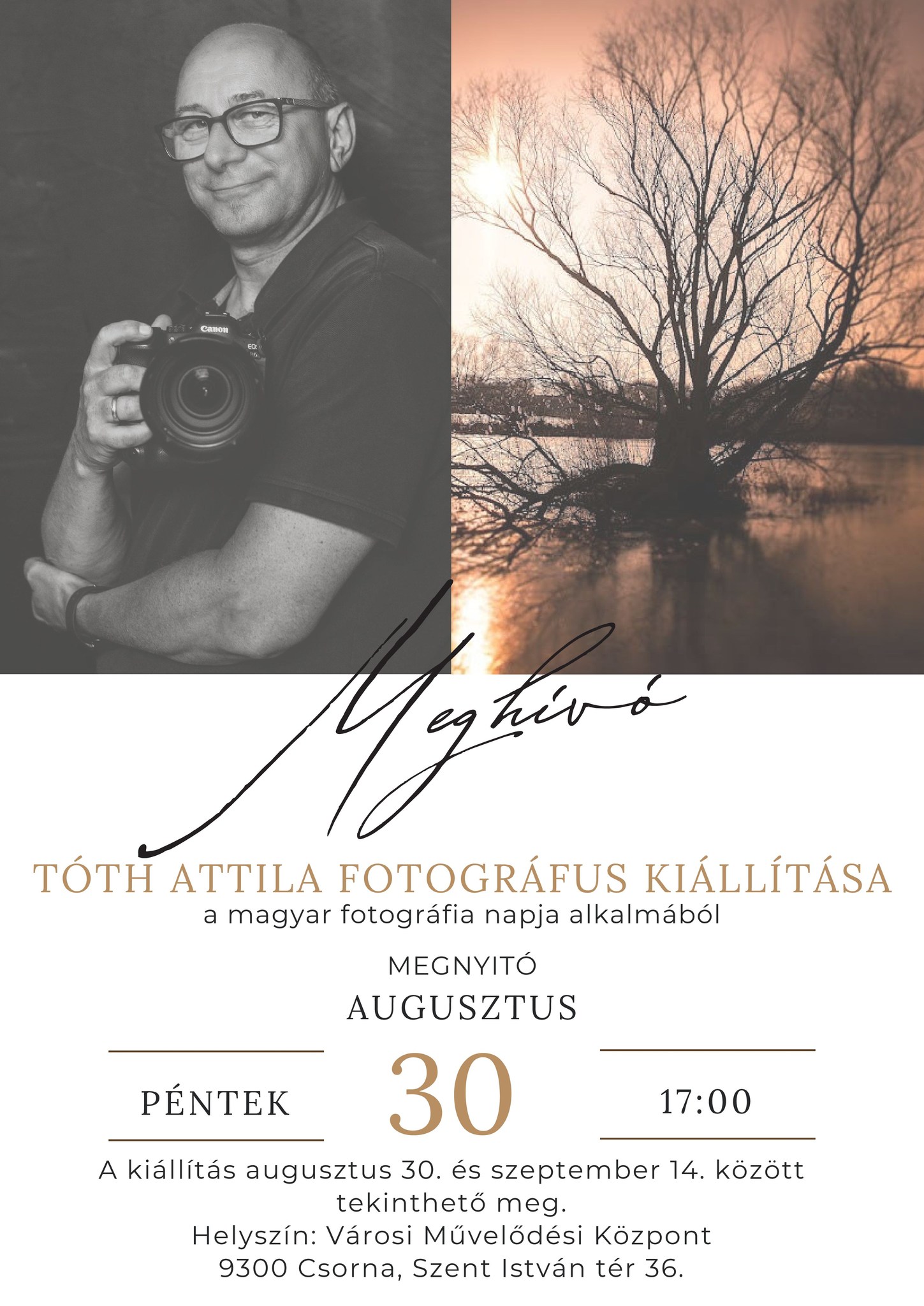 A Magyar Fotográfia Napja alkalmából a csornai Városi Művelődési Központban kiállítás nyílik Tóth Attila fotográfus munkáiból.