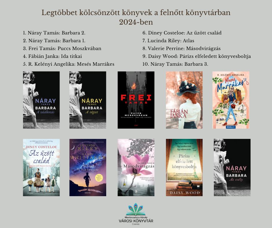 A 2024-es kölcsönzési sikerlistán a magyar szerzők domináltak, élükön Náray Tamással, akinek Barbara-trilógiája tarolt az olvasók körében. A generációkon átívelő családtörténetek különösen nagy népszerűségnek örvendtek.