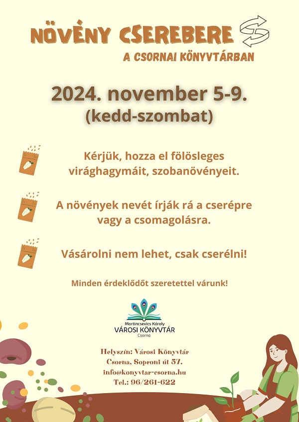 November 5. és november 9. között a Martincsevics Károly Városi Könyvtár növénycsere-akciót szervez „Növény Cserebere” címmel.