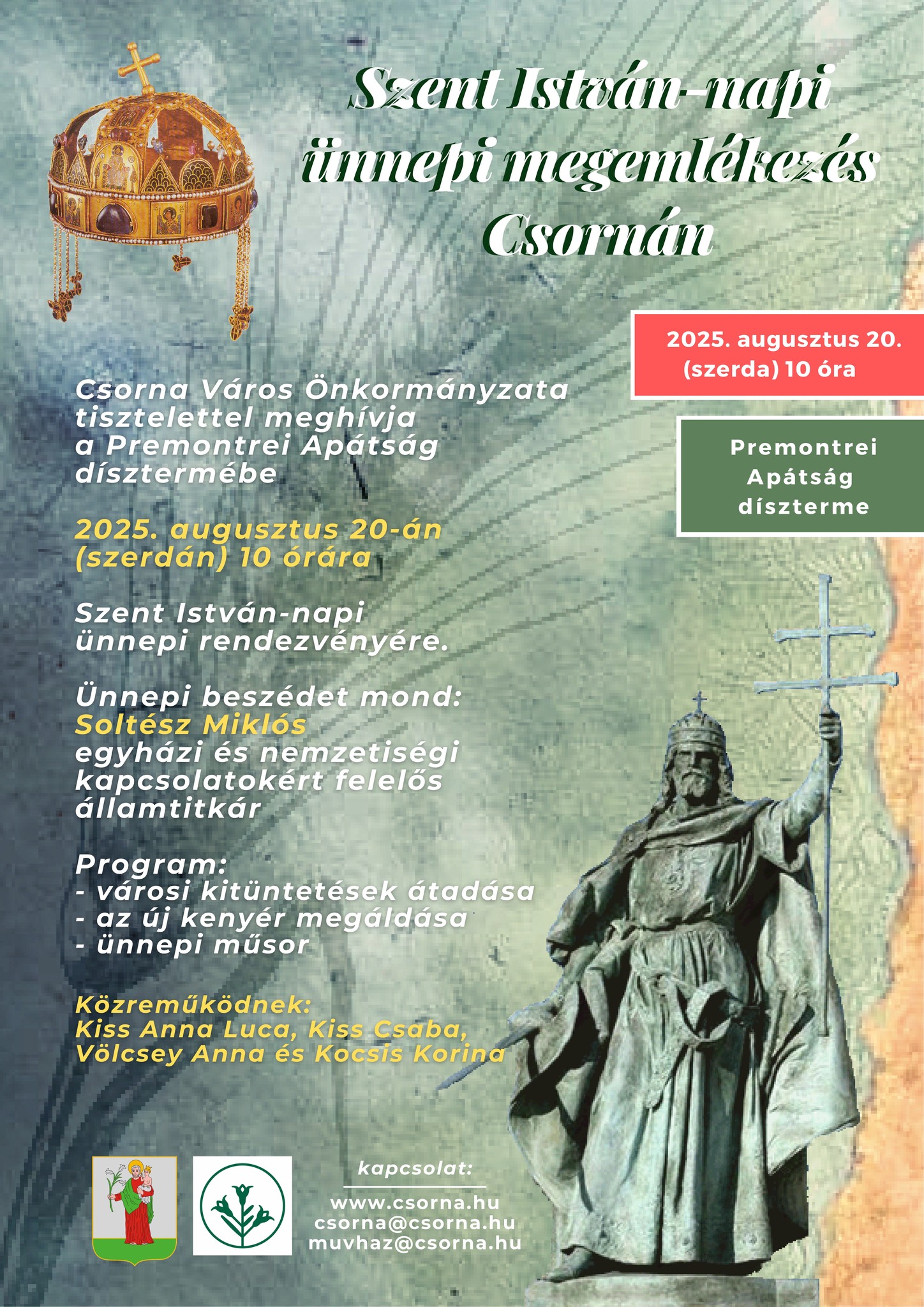Csorna Város Önkormányzata idén is méltóképpen emlékezik meg államalapító királyunkról, Szent Istvánról. Az ünnepség 2025. augusztus 20-án, szerdán 10 órakor kezdődik a Premontrei Apátság dísztermében.