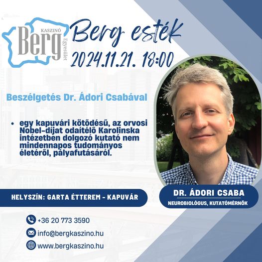 Az esemény vendége Dr. Ádori Csaba, a Karolinska Intézet kapuvári kötődésű kutatója, aki tudományos munkájáról és pályafutásáról mesél az érdeklődőknek.