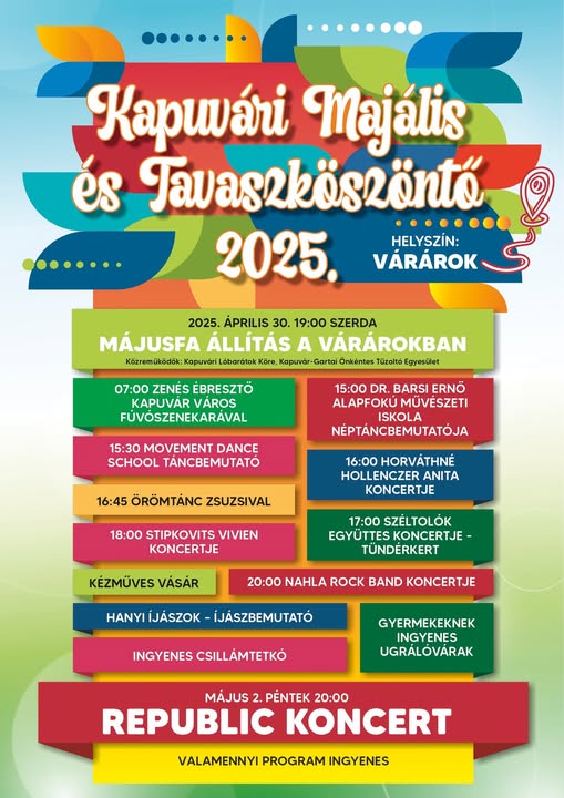 A rendezvény nyitánya április 30-án, 19:00 órakor lesz a májfa állításával, ahol közreműködik a Kapuvári Fúvószenekar. A programsorozat május 1-jén reggel 7:00-tól egészen estig kínál színvonalas műsorokat: táncbemutató, néptánc, gyermekkoncertek, népzenei fellépések, kézműves vásár és íjászbemutató is várja a látogatókat.