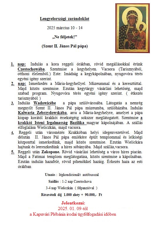 A Kapuvári Plébánia március 10-14. között különleges zarándoklatot szervez Lengyelországba, amelynek mottója II. János Pál pápa híres mondata: „Ne féljetek!”.