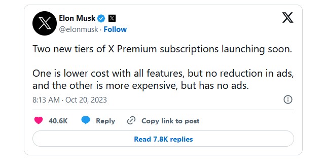 Az X pár napja vezette be tesztüzemben az Új-Zélandon és Fülöp-szigeteken regisztráló új felhasználók számára az évi egydolláros díjat. Az új felhasználók, akik nem fizetnek elő a közösségi oldalra, csak korlátozottan használhatják a platformot: a tartalmakat csak megtekinthetik, például olvashatják a posztokat, megnézhetik a videókat és bekövethetnek oldalakat. Musk tájékoztatása szerint ezzel a kéretlen üzeneteket és posztokat tömegesen közzétevő, automatizált fiókok ellen akar fellépni a közösségi oldal.