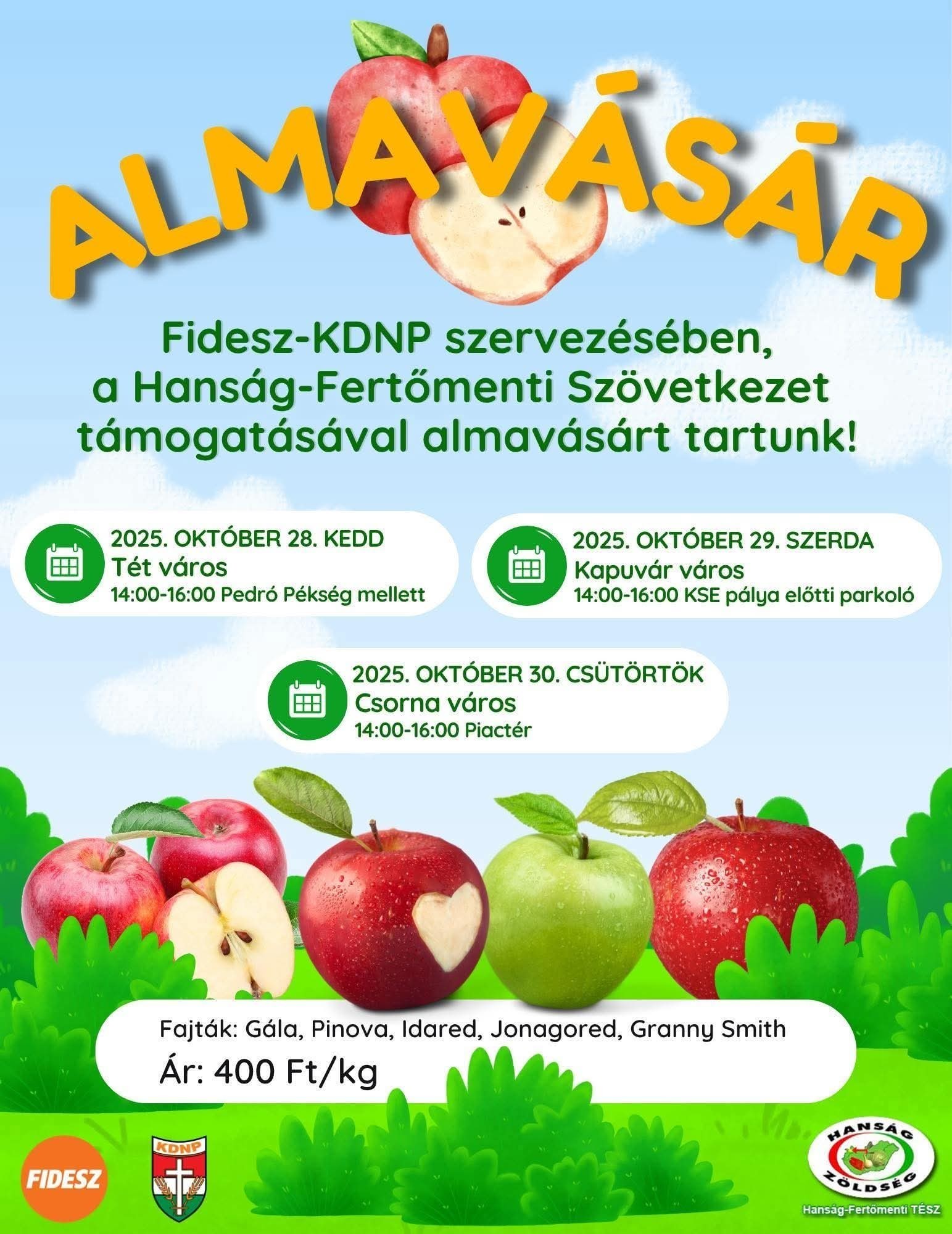 A Fidesz–KDNP szervezésében, a Hanság-Fertőmenti Szövetkezet támogatásával almavásárt rendeznek a térség három városában. A rendezvény célja, hogy a helyi lakosokhoz friss, minőségi magyar almát juttassanak el kedvező áron, egyúttal népszerűsítsék a hazai termelők termékeit.