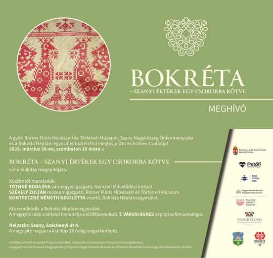 A győri Rómer Flóris Művészeti és Történeti Múzeum, Szany Nagyközség Önkormányzata és a Bokréta Néptánc Egyesület meghív minden érdeklődőt a Bokréta - Szanyi értékek egy csokorba kötve című kiállítás megnyitójára, amelyre március 29-én, 15:00 órakor kerül sor.