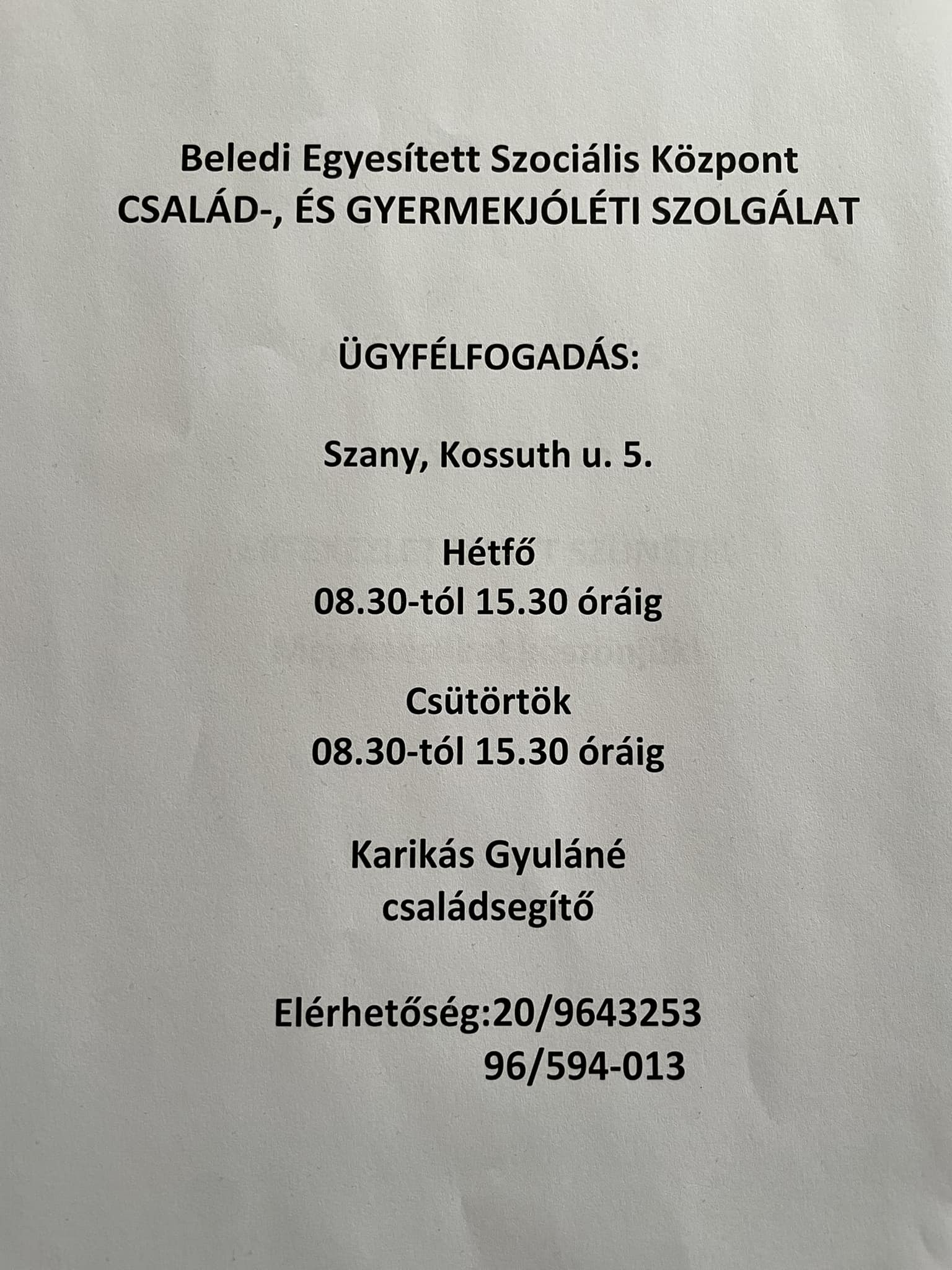 Család- és Gyermekjóléti Szolgálat ügyfélfogadása Szanyban