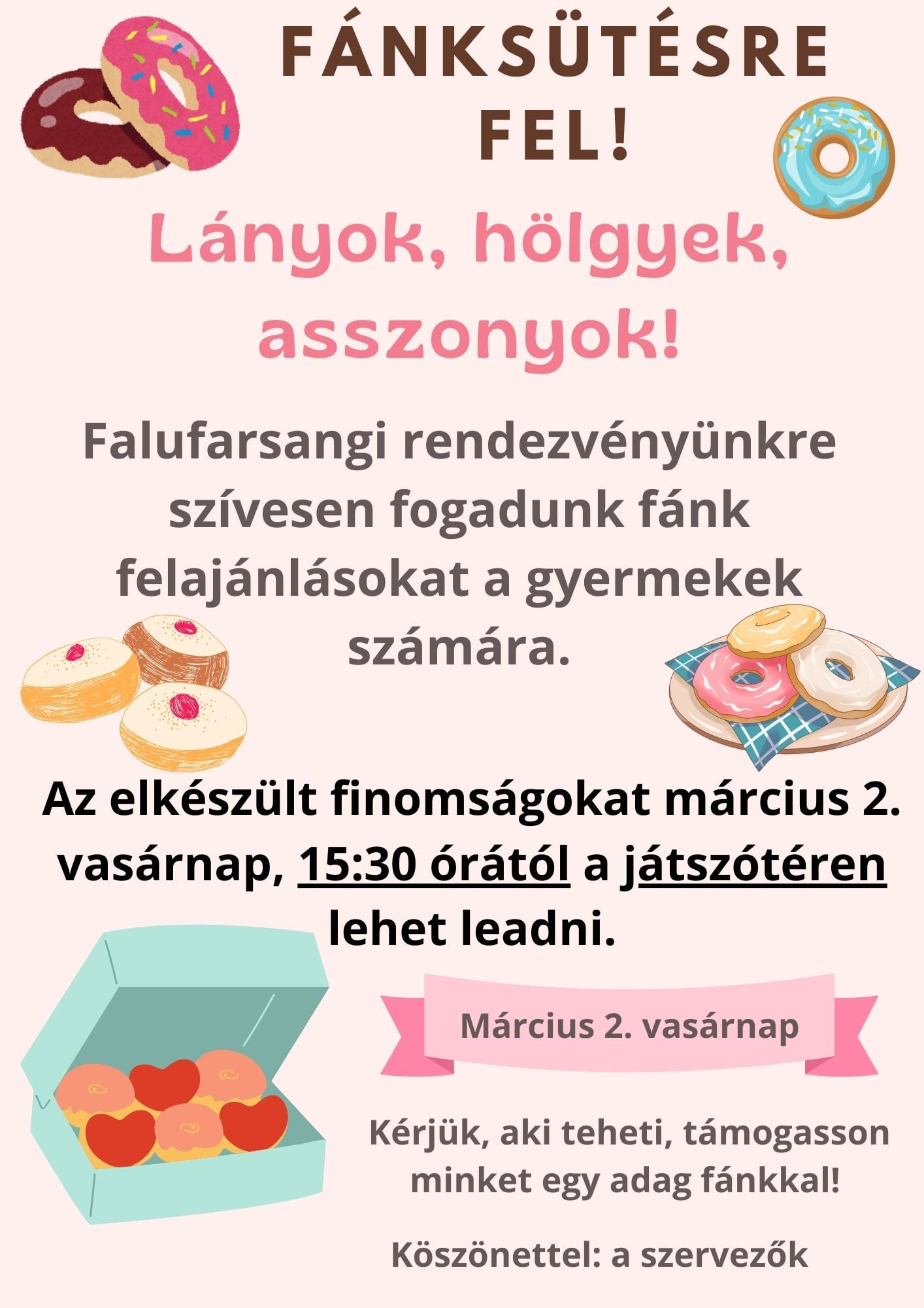 Aki kedvet érez hozzá, az elkészített fánkjait március 2-án, vasárnap 15:30 órától adhatja le a játszótéren.