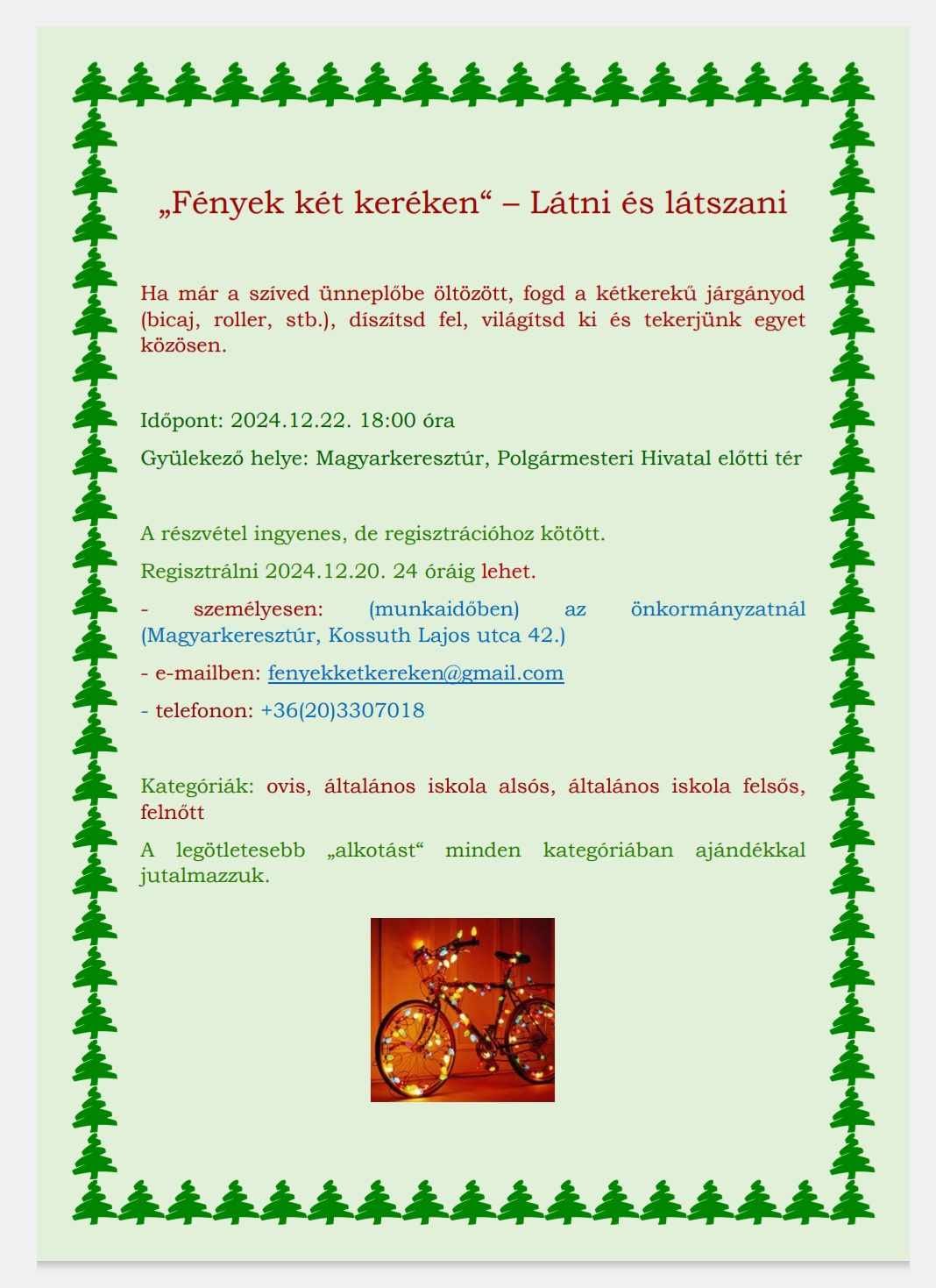 Az eseményre való részvétel ingyenes, de regisztrációhoz kötött, amit december 20-án éjfélig lehet megtenni személyesen, e-mailben vagy telefonon. A legötletesebb, leglátványosabb díszítést külön jutalommal díjazzák a következő kategóriákban: óvodások, általános iskola alsósok, felsősök és felnőttek. Gyülekező a Polgármesteri Hivatal előtti téren lesz.