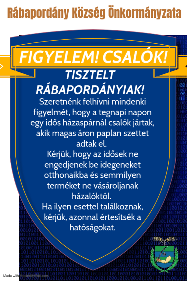 Rábapordány Község Önkormányzata figyelmezteti a lakosságot, hogy csalók jártak a településen. A jelentések szerint egy idős házaspárnál ismeretlen személyek magas áron paplan szettet adtak el, valószínűleg megtévesztés útján.