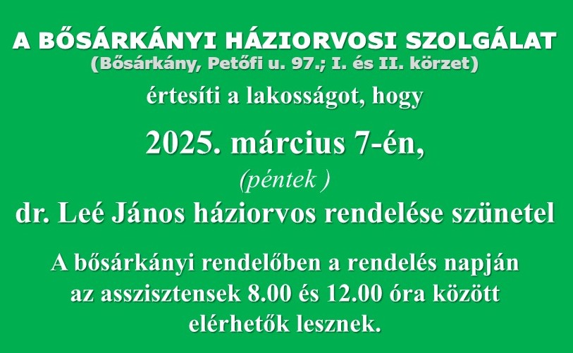 A Bősárkányi Háziorvosi Szolgálat értesíti a lakosságot, hogy március 7-én, pénteken dr. Leé János háziorvos rendelése szünetel.