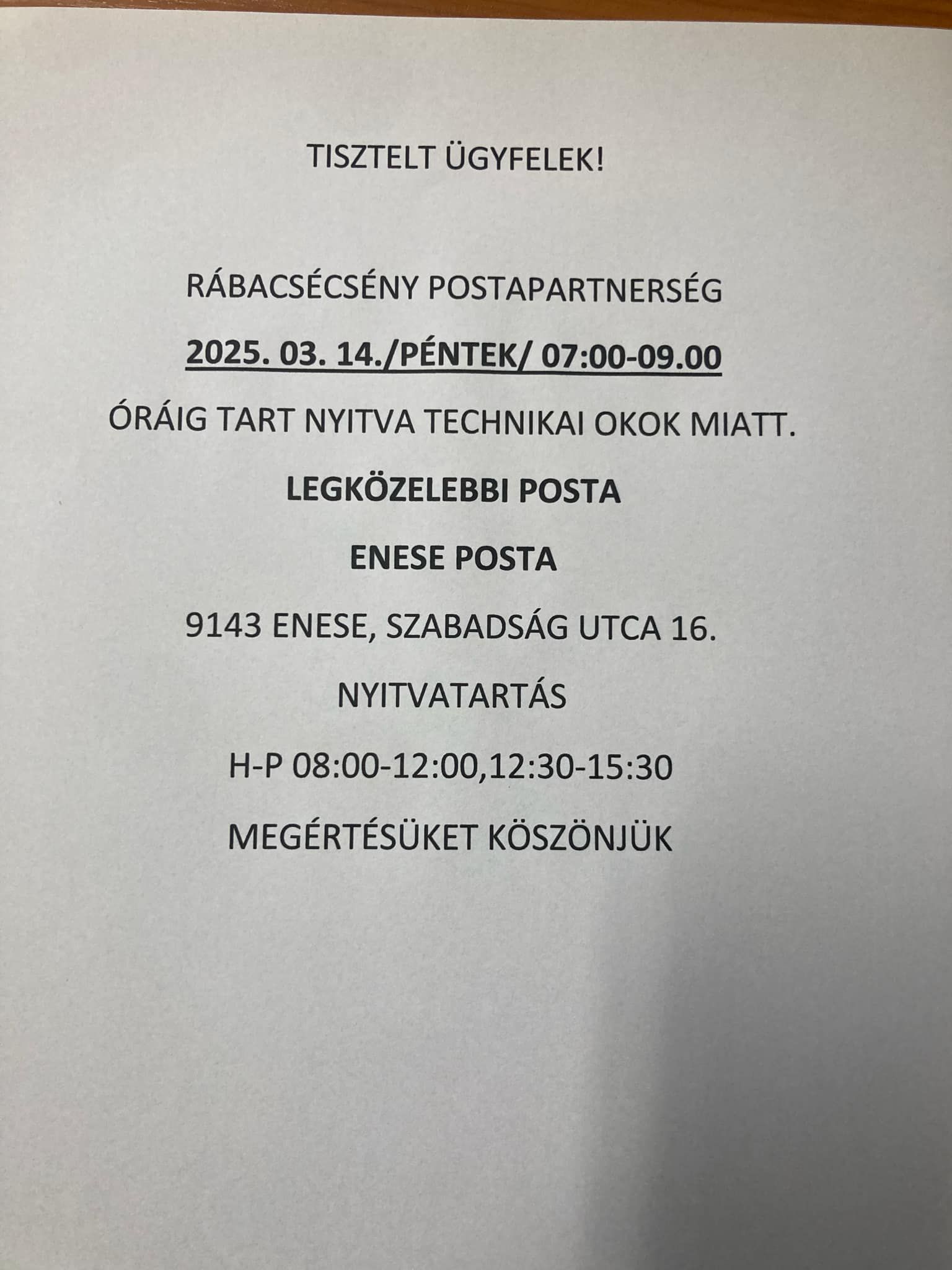 A rábacsécsényi postapartnerség ideiglenesen módosítja nyitvatartási idejét technikai okok miatt március 14-én, pénteken a posta kizárólag 07:00 és 09:00 óra között fogadja az ügyfeleket.