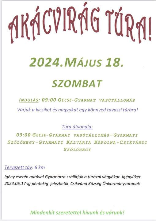 Az Akácvirág túrán 6 kilométert hagynak maguk mögött a résztvevők. A kirándulók szombat reggel kilenckor indulnak a Gecse-Gyarmat vasútállomásról és a Gyarmati Szőlőhegy, Gyarmati Kálvária kápolna útvonalán jutnak el a Csikvándi Szőlőhegyig. Igény esetén Gyarmatra szállítják a túrázni vágyókat, akik ezen kérésüket holnapig jelzik a csikvándi önkormányzatnál, melynek címe: Rákóczi Ferenc u. 24, telefonszáma: (06 96) 739 438.