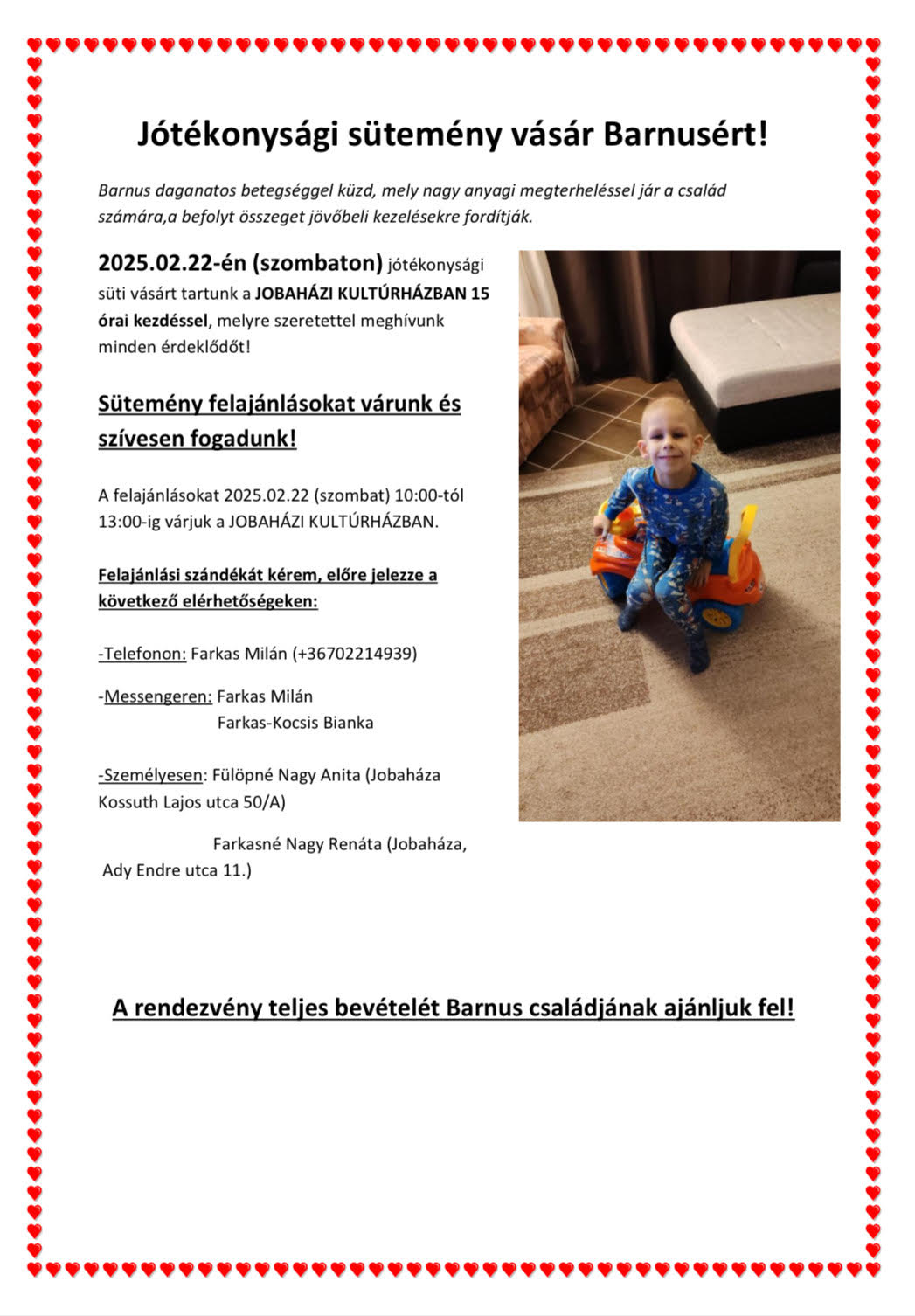 Felajánlási szándékukat előzetesen jelezhetik telefonon Farkas Milánnál (+36702214939), Messengeren keresztül Farkas Milán és Farkas-Kocsis Bianka elérhetőségén, vagy személyesen Fülöpné Nagy Anitánál (Jobaháza, Kossuth Lajos utca 50/A) és Farkasné Nagy Renátánál (Jobaháza, Ady Endre utca 11.).