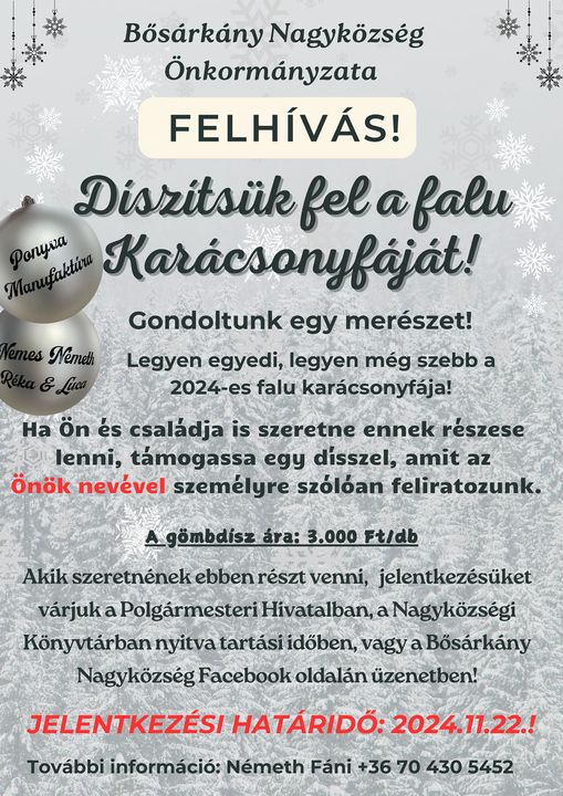 A Bősárkányi Nagyközség Önkormányzata egy igazán egyedi ötlettel rukkolt elő a 2024-es karácsonyi szezonra: meghívják a falubelieket, hogy saját díszeikkel szépítsék a falu karácsonyfáját.