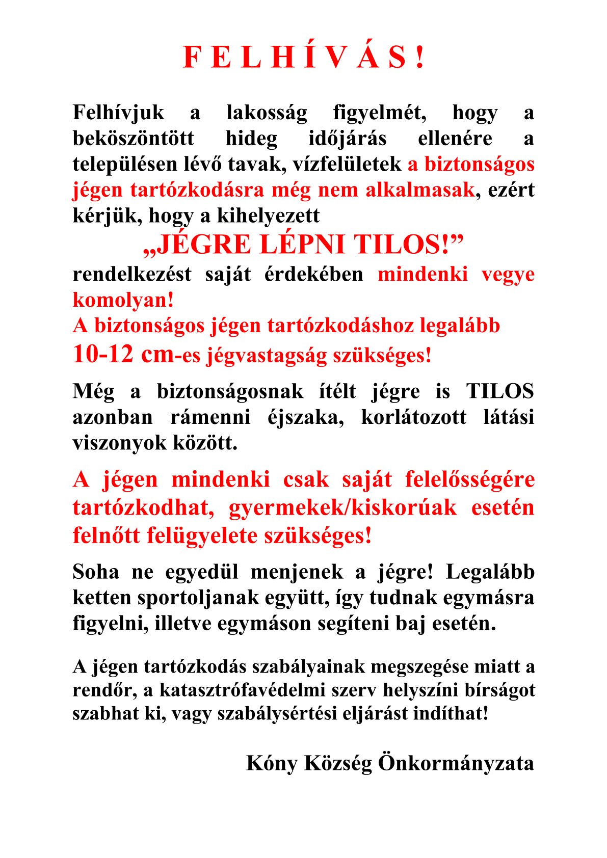 Kóny Község Önkormányzata felhívja a lakosság figyelmét, hogy a téli hideg ellenére a tavakon és egyéb vízfelületeken a jég még nem biztonságos.