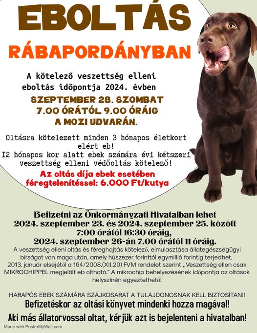 Rábapordányban szeptember 28-án, szombaton, 7:00 és 9:00 óra között kerül sor a kötelező veszettség elleni eb-oltásra a mozi udvarán.
