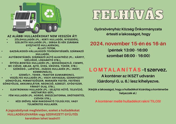 Győrsövényház Község Önkormányzata lomtalanítást szervez november 15-én és 16-án.