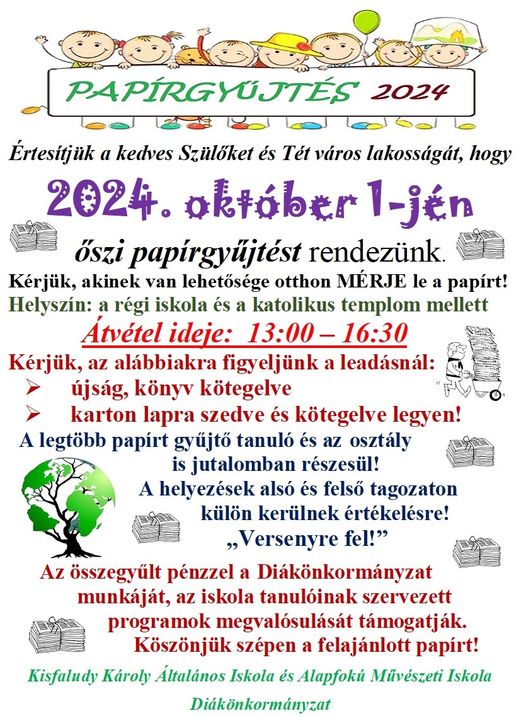 Tét városában és a helyi Kisfaludy Károly Általános Iskola közössége október 1-jén, kedden megrendezi az őszi papírgyűjtést.