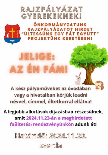Önkormányzatunk rajzpályázatot hirdet a „Ültessünk Egy Fát Együtt” projekt részeként. Várjuk óvodás és iskolás gyerekek rajzait a „Az Én Fám” témában.