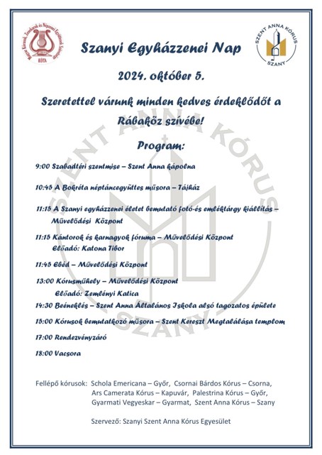 A délelőtt során a szanyi egyházzenei életet bemutató fotó- és emléktárgy kiállítást tekinthetik meg a látogatók a Művelődési Központban, ahol a kántorok és karnagyok fórumára is sor kerül, Katona Tibor előadásában. Délután kórusműhely és közös éneklés várja a résztvevőket, Zemenényi Katica vezetésével.