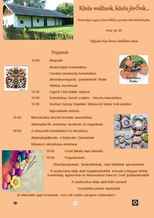 Az érdeklődők különféle kézműves foglalkozásokon vehetnek részt, mint például a fazekasság és mézeskalács-díszítés bemutatása. A gyermekeket élményprogramok várják, a délutáni programok között pedig a híres Szilsárkányi hímző szakkör is megmutatja tudását. A nap zárásaként Szent Mihály-napi tábortűz is lesz, ami tovább erősíti a közösség összetartását.