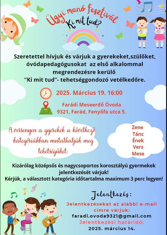 Március 19-én délután négy órakor különleges eseményre kerül sor a Farádi Meseerdő Óvodában, ahol az első alkalommal megrendezésre kerülő "Ki mit tud?" tehetséggondozó vetélkedő várja a középsős és nagycsoportos korosztályba tartozó gyermekeket.