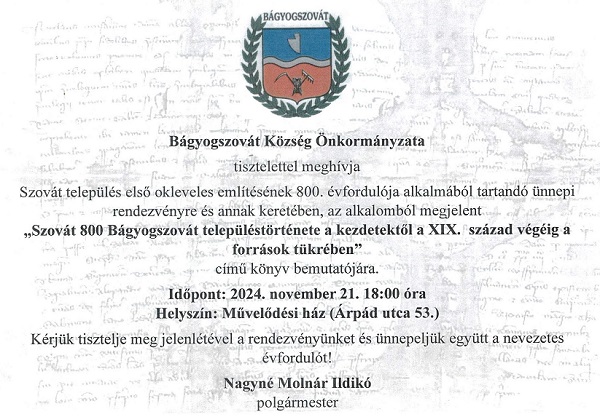 Bágyogszovát Község Önkormányzata szeretettel vár mindenkit egy történelmi jelentőségű ünnepi eseményre, amely november 21-én, csütörtökön este hat órakor kezdődik a Művelődési Házban az Árpád utca 53. szám alatt.