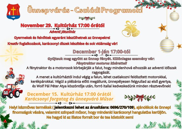 A helyi kézműves termékek árusítására az alábbi telefonszámon lehet jelentkezni: 0696/270/109, ezek mellett ajándékok és ünnepi finomságok is kaphatók lesznek.