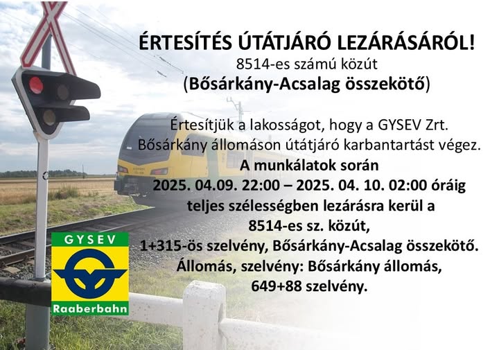 A GYSEV Zrt. tájékoztatja a lakosságot és a közlekedőket, hogy április 9-én 22:00 órától április 10-én 02:00 óráig teljes szélességben lezárásra kerül a 8514-es számú közút Bősárkány-Acsalag összekötő szakasza, a vasúti átjáró karbantartási munkálatai miatt.