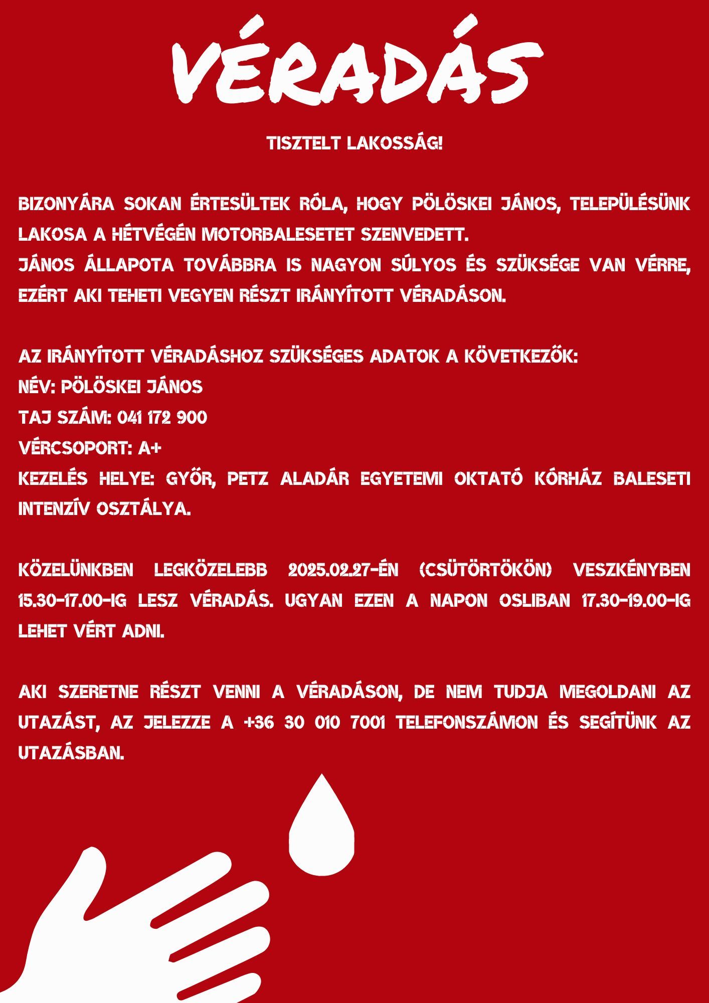 Állapotának stabilizálásához és gyógyulásához elengedhetetlen a folyamatos vérpótlás, ezért családja, barátai és a közösség segítségét kérik. Az irányított véradás lehetőséget biztosít arra, hogy a donorok célzottan egy adott beteg számára adjanak vért. János számára az A+ vércsoportú donorok véradása kiemelten fontos, de bármely más vércsoportú jelentkező is segíthet, hiszen a vérkészletek folyamatos utánpótlására szükség van.