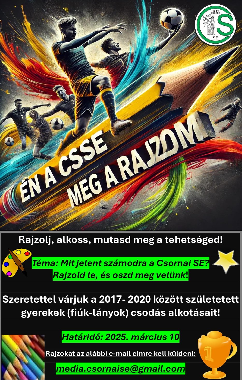 A pályázat témája: „Mit jelent számodra a Csornai SE?” A résztvevők szabadon engedhetik fantáziájukat és megörökíthetik papíron, hogy számukra mit testesít meg a csapat és a sport szeretete.